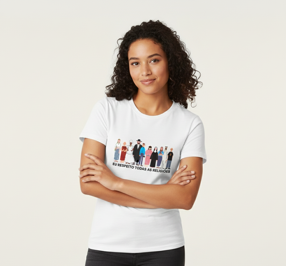 Uma camiseta de respeito. Trazendo na estampa a diversidade religiosa essa camiseta traduz o maior ensinamento de Jesus em uma imagem: "Amar a todos como a si mesmo", independente do seu modo de pensar, o amor e o respeito sempre prevalecem.